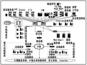該方案采用Cisco的ICM中間件軟件作為系統(tǒng)的CTI服務(wù)器軟件平臺(tái),并采用相關(guān)廠(chǎng)商的IVR和Dialer產(chǎn)品作為IVR服務(wù)器和外撥服務(wù)器軟件。地市客服中心采用了交換機(jī)的遠(yuǎn)端模塊設(shè)置遠(yuǎn)端座席。Cisco的ICM中間件不但具有大話(huà)務(wù)量處理的高性能,而且支持多點(diǎn)呼叫中心的設(shè)置和基于純IP技術(shù)的呼叫中心的擴(kuò)充,從而保證了系統(tǒng)的可擴(kuò)展性。系統(tǒng)結(jié)構(gòu)如圖1所示。