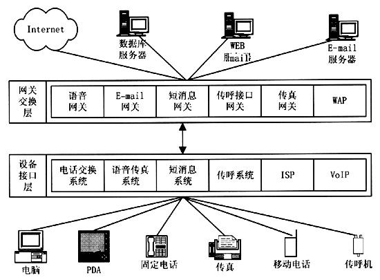 統(tǒng)一消息平臺集成了固定電話網(wǎng)、移動電話網(wǎng)和Internet網(wǎng)絡(luò)。目前,電話網(wǎng)和Internet網(wǎng)各自擁有獨(dú)立的網(wǎng)絡(luò)資源和信息服務(wù)領(lǐng)域,而這兩大網(wǎng)絡(luò)的用戶群存在著很大的交叉。電話的使用在中國已經(jīng)占有很高的普及率,傳統(tǒng)的160/168聲訊服務(wù)已經(jīng)成為中國百姓所熟悉的最具代表性的電話信息服務(wù),而Internet作為在中國剛剛興起的信息媒體,尚需要普通百姓逐漸認(rèn)識它、使用它。統(tǒng)一消息平臺將電話網(wǎng)和Internet網(wǎng)結(jié)合在一起,極大地?cái)U(kuò)大了兩大網(wǎng)絡(luò)各自的用戶群,電話用戶可以用電話或者傳真獲取Internet上的信息,電子郵件服務(wù)也可以不局限于Internet,而能對廣大的電話用戶開放。統(tǒng)一消息平臺為用戶帶來的是信息的方便、及時(shí),使人們在任何時(shí)間、任何地點(diǎn)都能夠獲取需要的信息。
