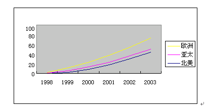 圖4顯示了UM產(chǎn)品和服務(wù)從1998到2003年的收入增長預(yù)測(cè)。UM產(chǎn)品和服務(wù)市場(chǎng)在2003年的總體收入預(yù)計(jì)為100億美元左右。圖5顯示統(tǒng)一消息郵箱的三個(gè)UM市場(chǎng)(北美、歐洲和亞太地區(qū))增長預(yù)測(cè)。