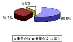 如圖2所示,集團(tuán)會(huì)議終端所占份額為56.5%,桌面會(huì)議終端為34.7%。桌面會(huì)議終端盡管發(fā)展時(shí)間不長(zhǎng),但由于其較好地集成了會(huì)議、數(shù)據(jù)等應(yīng)用,其市場(chǎng)份額也頗為可觀。與集團(tuán)會(huì)議終端相比,近年來(lái)增長(zhǎng)較為迅速。