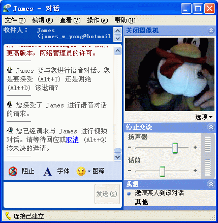 單擊對(duì)話框右邊的“啟動(dòng)攝像機(jī)”和“開始交談”,系統(tǒng)會(huì)提示你正在等待對(duì)方回應(yīng)視頻或語音對(duì)話的邀請(qǐng),對(duì)方接受,就開始進(jìn)行視頻通話(見圖11)。如果雙方都有攝像頭,你還可以通過視頻框下面的“選項(xiàng)”將自己的影像設(shè)為畫中畫的功能。