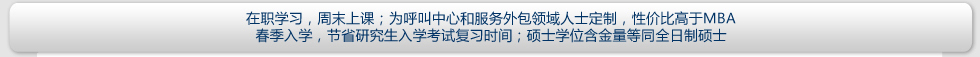 | 報(bào)名條件 | 擁護(hù)中國憲法,遵守法律、法規(guī),品行端正,身體健康,并能堅(jiān)持在職學(xué)習(xí); 大專及以上學(xué)歷,旨在提高本人專業(yè)素質(zhì)和學(xué)歷層次的 社會在職人士均可報(bào)名;擇優(yōu)錄取。 呼叫中心、服務(wù)外包領(lǐng)域的中高級從業(yè)者,英語基礎(chǔ)良好的人士將獲得優(yōu)先錄取機(jī)會。 |