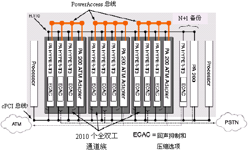 為了解決CompactPCI的這一限制,NMS開發(fā)出了PowerAccess體系結構,它借助現(xiàn)有的CompactPCI標準,同時把它的通道容量擴展到2048之上。這種體系結構以PowerAccess總線為特色,PowerAccess總線是一個輔助的4096個TDM時隙,支持現(xiàn)存的CompactPCI H.110總線。由于提供語音通道的增多,從而可以提高系統(tǒng)的密度。