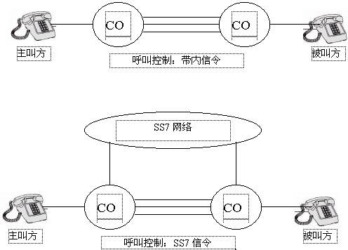 在任一個(gè)電話系統(tǒng)中,都要規(guī)定一些固定的信令機(jī)制來(lái)實(shí)現(xiàn)呼叫的建立和釋放。最初,象POTS(普通舊電話業(yè)務(wù))那樣的電話系統(tǒng)都是用帶內(nèi)信令來(lái)傳遞信息。帶內(nèi)信令是指信號(hào)的頻率在話音頻率范圍之內(nèi)(0.3~3.4kHz),比如:DTMF信號(hào)就屬于帶內(nèi)信號(hào)。帶內(nèi)信號(hào)是在話音通道內(nèi)傳遞的。相反,SS7使用一個(gè)完全獨(dú)立于話音網(wǎng)的數(shù)據(jù)網(wǎng)來(lái)傳遞信令,這樣可以大大提高電話網(wǎng)絡(luò)的利用率。比如,在呼叫發(fā)起但未建立完成之前,不需要分配話音電路,這使得傳遞的信令數(shù)據(jù)只和呼叫有關(guān)而和電路無(wú)關(guān),為在交換機(jī)之間、交換機(jī)和其它網(wǎng)絡(luò)之間高效、可靠地傳遞信息提供了可能。同時(shí)也支持更高級(jí)的應(yīng)用,如:主叫識(shí)別、無(wú)線漫游和800號(hào)業(yè)務(wù)。如下圖1,顯示出了帶內(nèi)信令和SS7在呼叫接續(xù)上的區(qū)別。