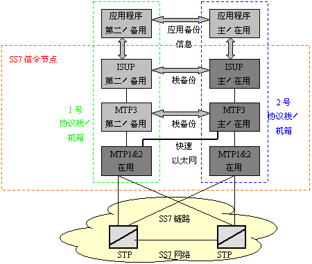 只有SS7鏈路出現(xiàn)故障時(shí),SS7協(xié)議才有相應(yīng)的規(guī)則去處理故障,對(duì)其它故障的處理必須在設(shè)計(jì)SS7平臺(tái)和整個(gè)系統(tǒng)結(jié)構(gòu)時(shí)予以考慮。還有一個(gè)普遍的要求是:軟件的升級(jí)過(guò)程中不能影響整個(gè)系統(tǒng)的運(yùn)行。能達(dá)到以上要求的一個(gè)解決方案是:使用兩個(gè)主機(jī)箱,在每個(gè)主機(jī)箱里插有SS7接口板,用于支持一條或多條SS7鏈路。讓兩個(gè)主機(jī)都使用一個(gè)SS7地址,也就是共用一個(gè)信令點(diǎn)編碼,這樣遠(yuǎn)端的交換機(jī)或STP就會(huì)認(rèn)為這兩個(gè)主機(jī)是一個(gè)完整的系統(tǒng)。這樣,這兩個(gè)主機(jī)組成的系統(tǒng)就能在其中一個(gè)出現(xiàn)故障時(shí)仍能正常工作。