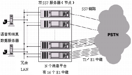 那兩個SS7節(jié)點(diǎn)是以冗余方式配置的,共享相同的信令點(diǎn)編碼,為所有的媒體節(jié)點(diǎn)提供呼叫控制。圖中所示的所有SS7鏈路采用單信令點(diǎn)編碼冗余方式備份,即使其中一個 SS7節(jié)點(diǎn)出現(xiàn)故障,信令系統(tǒng)仍能繼續(xù)為呼入提供不中斷的語音信箱訪問。