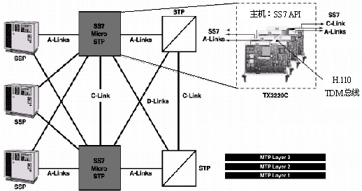 微型STP連接多條從SSP來的鏈路,并把它們集中到一個連接STP的鏈路集之中,這一鏈路集有兩條鏈路。微型STP到每個SSP也有兩條鏈路組成的一個鏈路集。微型STP由完全相同配置的一對構(gòu)成,以實(shí)現(xiàn)高可用性和高可靠性,兩個STP之間用交叉鏈路(C鏈路)相連接。另外,微型STP上的每個端口可以設(shè)置一個唯一的信令點(diǎn)編碼,以便移除SS7鏈路時不影響端點(diǎn)SSP。