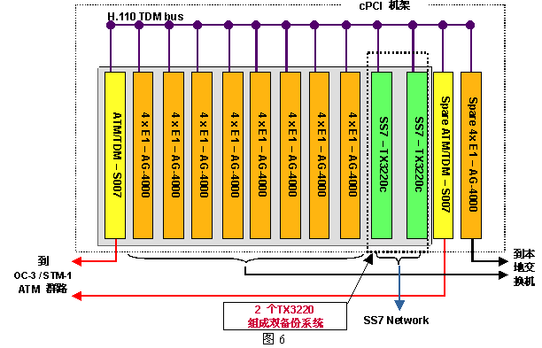 為具體起見(jiàn),圖6給出一個(gè)960話(huà)音端口的應(yīng)用方案,其中用到了三種NMS公司的設(shè)備:AG-4000c、S007和TX-3220c,圖中未列出用來(lái)運(yùn)行應(yīng)用程序的CPU板(AG4000系列板卡不含CPU,而AG600eC包含了CPU)。
