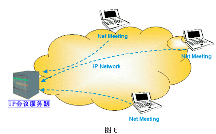 如圖8所示,IP會議包含兩個(gè)基本組件:IP會議服務(wù)器(IP Conference Server)和IP會議客戶端(如Netmeeting等)。