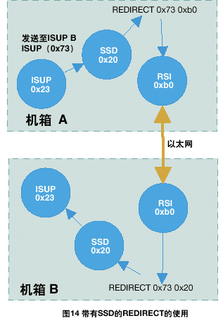 運(yùn)行在信令卡上的協(xié)議模塊,接收端(對(duì)方)的REDIRECT語句應(yīng)該通過ssd或ssds驅(qū)動(dòng)(通常情況下module_id為0x20)來對(duì)訊息進(jìn)行重定向,如圖14所示。