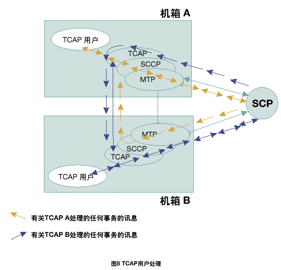 每個(gè)TCAP將所有接收的信息傳遞到同機(jī)箱中的TCAP用戶任務(wù)中。根據(jù)每一個(gè)TCAP中不同的應(yīng)用層或用戶,將TCAP層的本地應(yīng)用程序發(fā)送的傳送會(huì)話和組件原語傳遞給正確的TCAP。在雙系統(tǒng)環(huán)境中,接收訊息可以在任何MTP和SCCP層上共享;因此,一個(gè)TCAP層接收由其它TCAP處理的應(yīng)用在激活事務(wù)上的TCAP訊息是可能的。