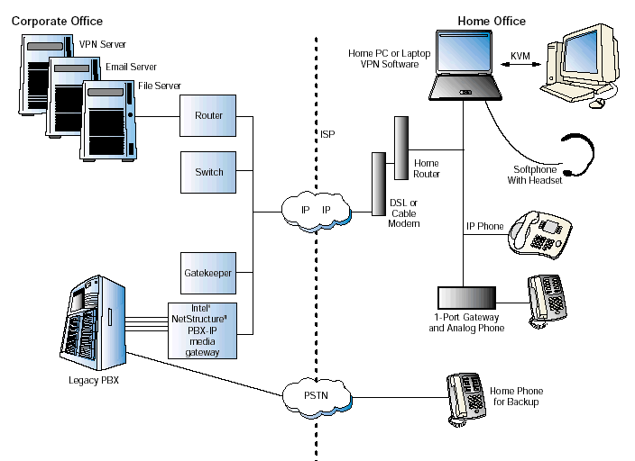 為了實(shí)現(xiàn)這個(gè)VoIP解決方案,PBX-IP網(wǎng)關(guān)連接到了辦公室里的原有的PBX和關(guān)鍵系統(tǒng)上,還有網(wǎng)守軟件實(shí)現(xiàn)一些呼叫的路由以及地址轉(zhuǎn)換。然后遠(yuǎn)程辦公者連接到了網(wǎng)關(guān)上--最終連接到公司PBX上--或者使用IP軟電話,或者一個(gè)實(shí)際的IP電話,或者一個(gè)單端家庭網(wǎng)關(guān)連接到模擬耳機(jī)上。