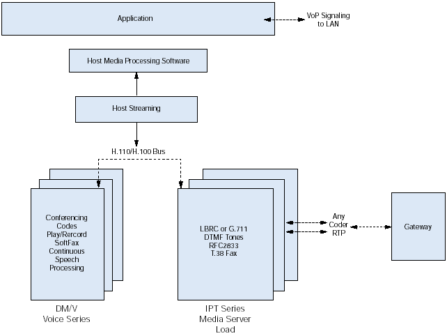 如圖2所示,IPT系列板卡可以通過(guò)H.110總線連接到任何一個(gè)高密度的Dialogic Dialogic DM/V語(yǔ)音系列媒體處理板卡上。開(kāi)發(fā)商通過(guò)組合IPT系列和DM/V板卡,便可以分發(fā)他們的解決方案,包括語(yǔ)音處理、傳真、講話以及會(huì)議功能,這套解決方案可以使每個(gè)系統(tǒng)可以從數(shù)以百計(jì)的端口升級(jí)到數(shù)以千計(jì)的端口。開(kāi)發(fā)商也可以選擇使用IPT系列板卡作為高密度接口板卡,并連接到PCI總線使其可以訪問(wèn)在主機(jī)處理器上執(zhí)行的媒體處理功能。