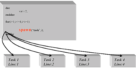 VOS內(nèi)部同時運行4個任務(wù)。開始只有一個任務(wù),此任務(wù)產(chǎn)生了4個任務(wù),各任務(wù)間互相傳遞參數(shù)(通道號)。函數(shù)arg(1)檢索參數(shù)個數(shù)1,這種情況下,arg()是通道號碼。