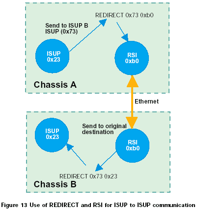 例如,一個雙ISUP系統(tǒng)應該由兩個ISUP部分組成,每個缺省module_id都為0x23。A方ISUP的設(shè)置數(shù)據(jù)表示另一個ISUP部分的module_id為0x73。因此,在A方將會有一個重定向的動作來對經(jīng)過RSI發(fā)送往0x73的任何消息重新定向,在B方,應該有一個REDIRECT語句將B方RSI所接收的所有目標為0x73的消息路由到本地ISUP。標識為0x23。如圖13所示。