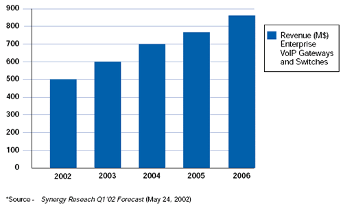 然后, Synergy也預測VoIP網(wǎng)關和交換應用從2002年到2006年每年會有34.6%的增長. 需要產(chǎn)品來把傳統(tǒng)電話交換網(wǎng)絡和IP網(wǎng)絡橋接起來.