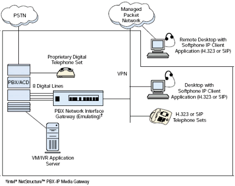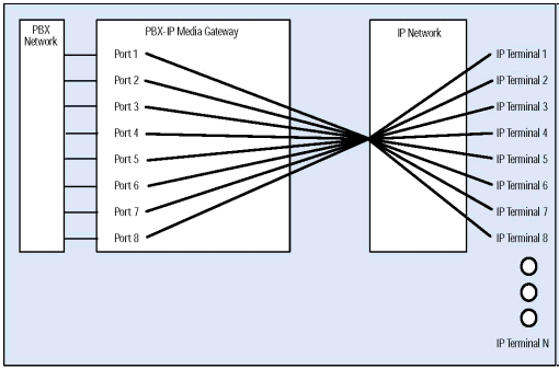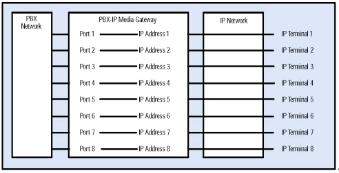PBX-IP 媒體網(wǎng)關可以把IP電話連接到傳統(tǒng)PBX上, 給PBX集成了網(wǎng)絡應用, 擴展了PBX, 集成了企業(yè)局域網(wǎng)或廣域網(wǎng)語音,