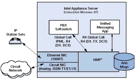 PBX 應用可以被實施在一個低成本的Dialogic應用設備或一個使用Dialogic處理器的普通臺式計算機上. 最終用戶可以根據(jù)需要選擇平臺.