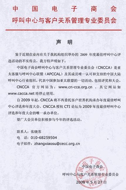 鄭重聲明: CNCCA授權(quán)CTI論壇為2009年度中國(亞太)最佳呼叫中心評選和年度大會的唯一承辦單位。